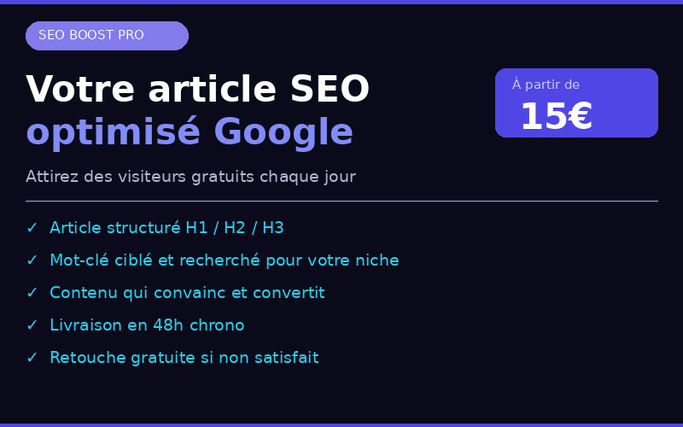 "Vous avez un site ou une boutique en ligne mais vous n'apparaissez pas sur Google ? Je suis la solution à votre problème. Je rédige des articles SEO optimisés qui attireront l'attention de votre marché et un trafic gratuit et qualifié vers votre site. L'objectif est simple : transformer vos visiteurs en acheteurs, sans qu'ils aient besoin d'aller chercher ailleurs. Ce que vous obtenez avec moi : ✅ Un article structuré H1/H2/H3 prêt à publier ✅ Un mot-clé recherché et ciblé pour votre niche ✅ Un contenu qui convainc et qui convertit ✅ Livraison en 48h chrono Je suis spécialisé dans le e-commerce et les blogs. Si vous voulez plus de clients sans payer de pub, vous êtes au bon endroit."