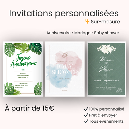 Je vous propose de créer votre invitation ou faire-part personnalisé sur Canva, adapté à votre événement et à vos envies.
