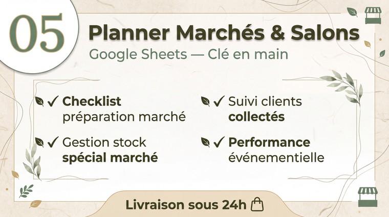 Je vais te fournir un planner Google Sheets complet pour organiser et rentabiliser tes marchés et salons art