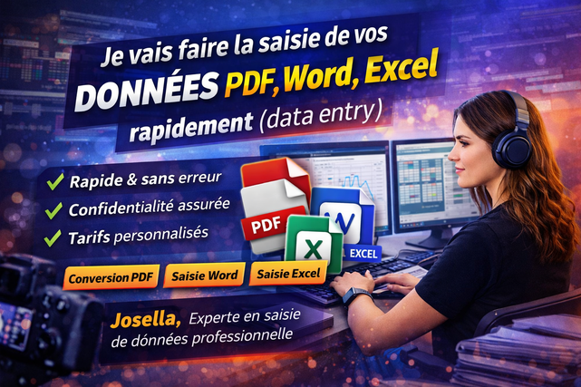 👋 Bonjour et bienvenue ! Je suis Josella, spécialisée dans la saisie de données, le graphisme, la transcription audio/vidéo et le montage vidéo. J’aide les entrepreneurs, créateurs de contenu et entreprises à organiser leurs données, produire des visuels impactants et créer des vidéos professionnelles. 💡 Mon objectif est de vous fournir un service rapide, précis et polyvalent, pour vous faire gagner du temps et améliorer votre communication digitale. 📊 Saisie de données Je peux vous aider à : ✔️ Saisie de données sur Word ou Excel ✔️ Organisation et mise en forme de documents et tableaux ✔️ Conversion de fichiers PDF vers Word ou Excel ✔️ Vérification et correction des données 👉 Des fichiers clairs, structurés et faciles à exploiter. 🎨 Graphisme ✔️ Création de visuels pour réseaux sociaux ✔️ Bannières et miniatures ✔️ Retouches simples et designs attractifs 👉 Des visuels modernes et professionnels pour votre communication. 🎧 Transcription audio / vidéo ✔️ Transcription précise d’audios et vidéos ✔️ Interviews, podcasts, réunions ✔️ Textes clairs et corrigés 👉 Des transcriptions prêtes à être utilisées. 🎬 Montage vidéo ✔️ Montage pour YouTube, TikTok, Instagram ✔️ Coupe, transitions, sous-titres simples ✔️ Vidéos dynamiques et engageantes 👉 Des vidéos professionnelles et prêtes à publier. 💡 Pourquoi choisir mon service ? ✔️ Polyvalence complète ✔️ Travail rapide et soigné ✔️ Respect des délais et consignes ✔️ Communication claire et professionnelle Votre satisfaction est ma priorité. 💰 Offre de base 👉 10 € Idéal pour une mission simple de saisie, graphisme, transcription ou montage. 📩 Passez votre commande 🚀 Commandez maintenant et obtenez un service fiable pour vos données, visuels et vidéos. Je serai ravie de vous accompagner dans vos projets digitaux et créatifs.