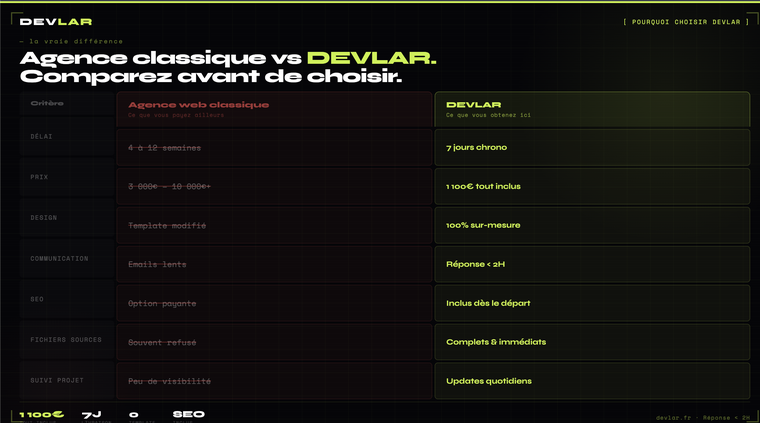 Vous en avez assez d'attendre des semaines pour avoir un site qui ne ressemble à rien ? Chez DEVLAR, on fait les choses différemment.