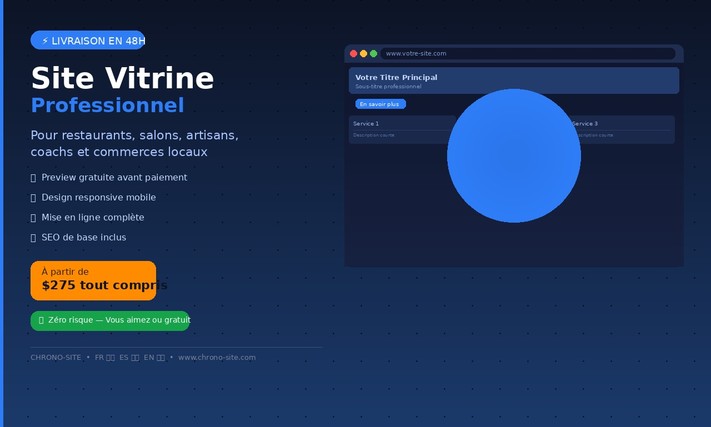 Vous êtes restaurant, artisan, coiffeur, coach ou commerçant et vous n'avez pas encore de site web ? Je crée votre site vitrine professionnel, moderne et responsive (adapté mobile) en 48h. Ce qui est inclus dans l'offre de base (250€) : Site vitrine jusqu'à 5 pages (Accueil, À propos, Services, Galerie, Contact) Design moderne et personnalisé à votre image Compatible mobile, tablette et desktop Formulaire de contact intégré Optimisation SEO de base Mise en ligne complète Mon approche unique : Avant tout paiement, je vous envoie une preview gratuite de votre site. Vous ne payez que si le résultat vous plaît. Zéro risque. Envoyez-moi un message avec le nom de votre activité et je vous prépare une preview gratuite !
