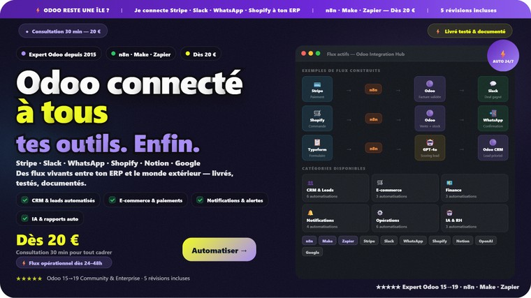 Tu utilises Stripe pour les paiements, Slack pour ton équipe, WhatsApp pour tes clients, Shopify pour ta boutique… et Odoo reste une île isolée. Tu ressaisis les mêmes données, tu envoies des notifications manuellement, tu exportes des fichiers Excel chaque lundi.