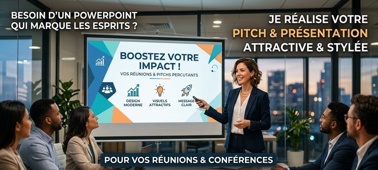 Vous avez besoin d’une présentation claire, dynamique et mémorable pour vos clients, investisseurs ou réunions ? Je transforme vos idées en diapositives percutantes, visuelles et faciles à comprendre.