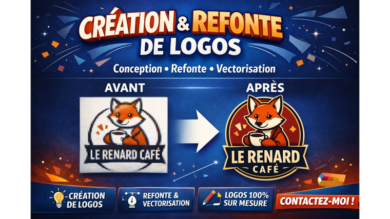 Je crée ou modernise votre logo en vectoriel haute définition, utilisable à toutes les tailles sans perte de qualité. Que vous démarrez de rien, d'un dessin rapide ou d'un ancien visuel flou, je vous livre un design net, actuel et parfaitement adapté à votre business.