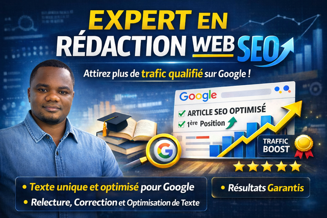 Vous avez besoin de contenus qui attirent du trafic et convainquent vos visiteurs d'agir. Je suis là pour ça. Chaque jour, des milliers de sites publient des articles mal structurés, bourrés de mots-clés sans âme, qui ne rankent jamais — et ne vendent rien. Ce n'est pas ce que vous aurez avec moi. Rédacteur web SEO confirmé, j'écris des contenus pensés pour Google et pour vos lecteurs. Résultat : un trafic qui monte, une audience qui reste, et des visiteurs qui passent à l'action. Ce que vous obtenez concrètement : ✅ Textes 100% uniques, vérifiés anti-plagiat (Copyscape) — aucun risque de pénalité Google ✅ Optimisation SEO on-page complète : structure Hn, intention de recherche, maillage interne, densité de mots-clés ✅ Livraison en 24 à 48h — vos projets avancent sans attendre ✅ Révisions illimitées — vous êtes satisfait, ou on retravaille. Sans discussion. ✅ Expertise prouvée dans 4 secteurs exigeants : Santé & bien-être · E-commerce · Finance & business · Immobilier Pour qui je travaille ? Pour les entrepreneurs, PME, agences et créateurs de contenu francophones qui veulent des textes qui font vraiment le travail — pas juste remplir une page. Comment ça se passe ? Vous passez commande ou vous m'envoyez un message avec votre brief J'analyse votre sujet, votre cible et vos mots-clés Vous recevez un contenu structuré, optimisé et prêt à publier Pas de mauvaises surprises. Pas de délais non respectés. Juste du contenu qui performe. 🚀 Votre prochain article SEO est à un clic. Passez commande maintenant — je m'occupe du reste.