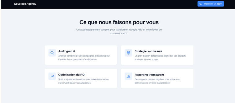 Je vous accompagne dans la création de **landing pages efficaces et orientées conversion**, avec un objectif clair : transformer vos visiteurs en prospects grâce à un système simple et performant de prise de rendez-vous.