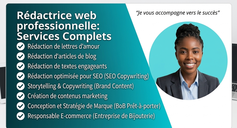 Salut ! Je me nomme Erika Passionnée par les mots et dotée d'une plume rigoureuse, je mets mon talent à votre disposition pour donner de la valeur à vos contenus numériques. Pour 10 € (environ 6560 XAF), je m'engage à rédiger un article de 500 mots unique, sans aucun plagiat, structuré avec soin et parfaitement optimisé pour le référencement naturel (SEO). Que vous ayez besoin d'un ton professionnel, amical ou informatif, je garantis une recherche approfondie sur votre sujet et une livraison avec zéro faute d'orthographe. Sérieuse, réactive et soucieuse de votre satisfaction, je respecte scrupuleusement vos délais pour vous offrir un texte captivant qui répond précisément à vos attentes. Cliquez simplement sur le bouton "Commander" et confiez-moi vos idées pour leur donner vie dès aujourd'hui !