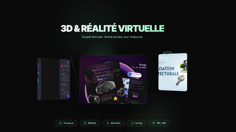 Visites virtuelles immobilières, showrooms 3D, expériences VR gaming, modélisations architecturales haut de gamme.