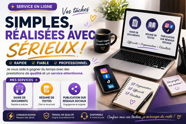 Je suis une étudiante sérieuse, motivée et organisée. Je propose mes services pour vous aider dans vos tâches simples en ligne.
