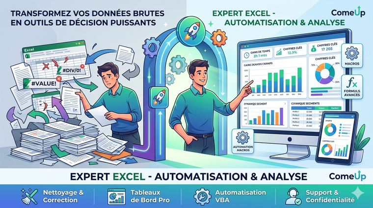 Un outil Excel bien conçu n'est pas seulement un tableau : c'est un gain de temps massif pour votre activité et une clarté totale sur vos chiffres. Expert sur Microsoft Excel, j'accompagne les entrepreneurs et les entreprises pour automatiser leurs processus et sublimer leurs données.