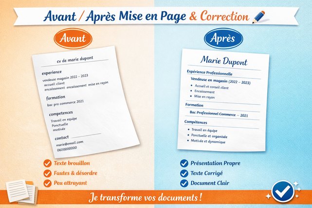 Je vais mettre en page vos documents professionnels et corriger vos textes