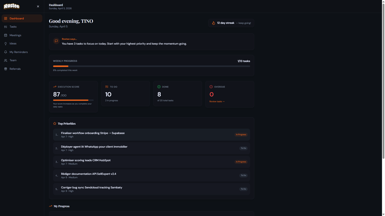 → Dashboard React avec score de productivité, tâches, meetings, idées