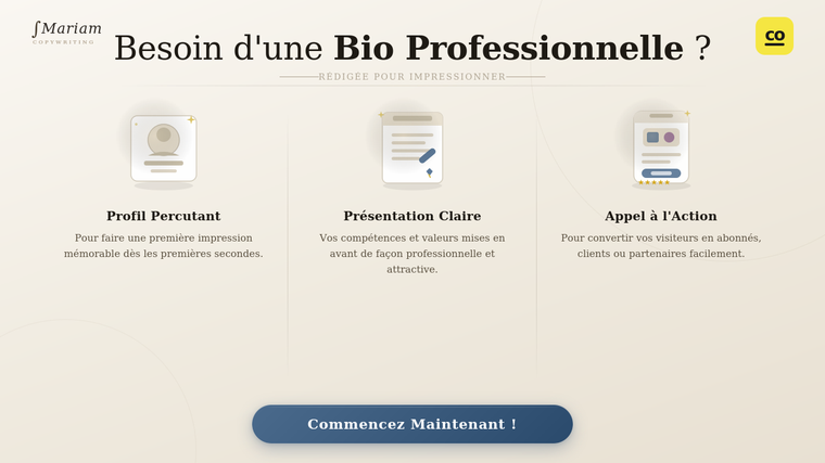 Votre bio actuelle ne reflète pas votre vrai potentiel ? Vous ne savez pas comment vous présenter de façon professionnelle et attractive ? Vous voulez une bio qui convertit les visiteurs en clients ou abonnés ?