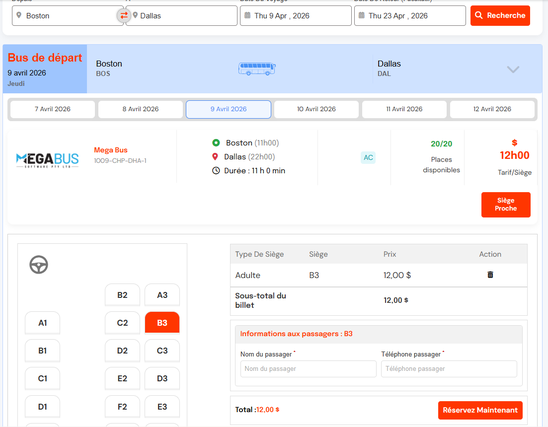 Que ce soit pour des trajets en bus (avec ou sans plan de siège), des billets de train, des traversées en ferry ou des réservations de bateaux et navettes, notre outil s’adapte à tous vos projets. Conçu pour simplifier et optimiser la gestion de vos services de transport et de billetterie, il allie flexibilité, efficacité et simplicité — parfait pour les entreprises qui veulent automatiser leurs processus et offrir une expérience client sans faille.