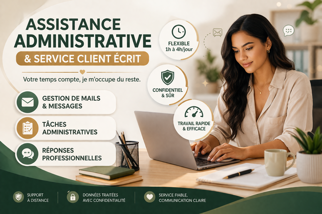 Je vous propose une assistance professionnelle pour la gestion de vos tâches administratives et de votre service client, uniquement à l’écrit (emails, messages, chat). Sérieuse, organisée et attentive aux détails, je vous aide à gagner du temps tout en assurant une communication claire et soignée avec vos clients.
