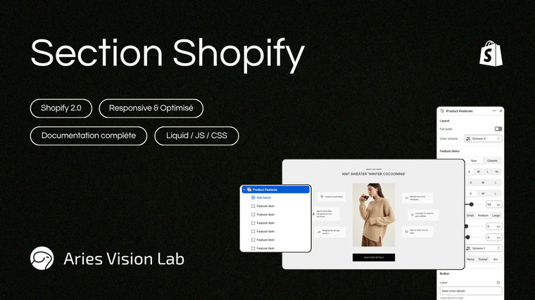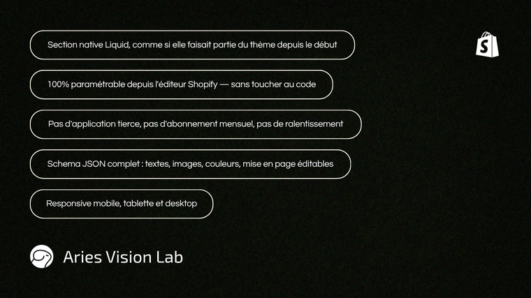 Je crée des sections Liquid sur mesure, 100% paramétrables depuis l'éditeur de thème Shopify. Pas besoin d'application tierce, pas de ralentissement, pas de code fragile. Une section native, propre, qui fonctionne comme si elle faisait partie du thème depuis le début.