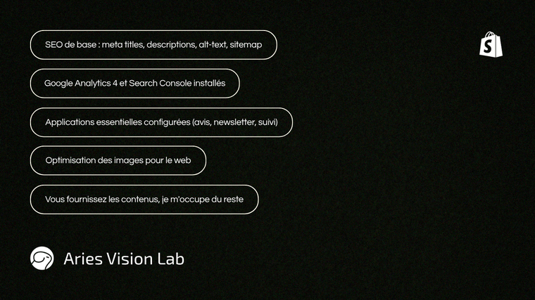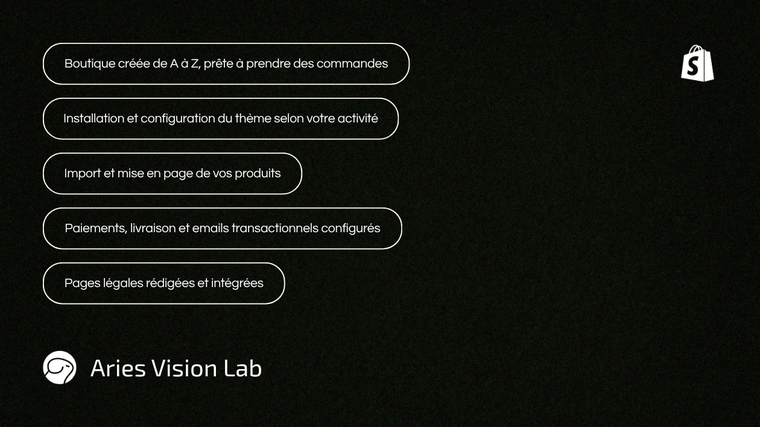 Je crée votre boutique de A à Z : installation du thème, mise en page, produits, paiements, livraison, pages légales, et SEO de base. Vous recevez une boutique prête à prendre des commandes.