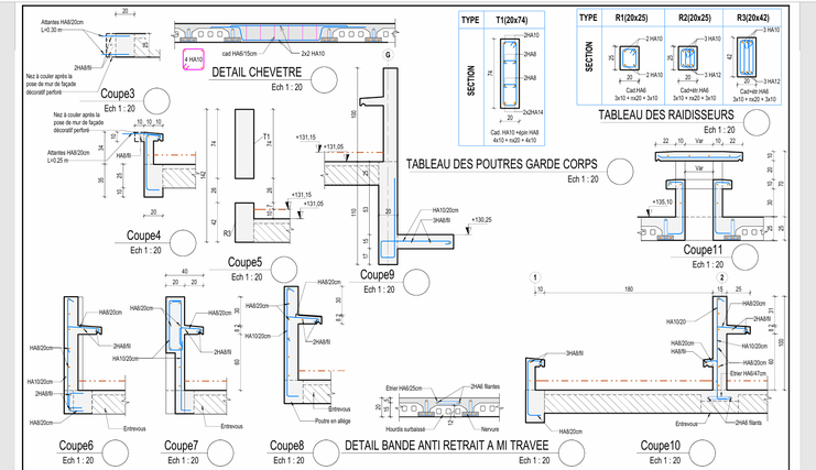 C'est la phase de mise en forme. Je réalise les plans de structure complets avec toutes les informations nécessaires : vues en plan, coupes, détails constructifs, nomenclatures des éléments, cotations précises et notes techniques. Les plans sont clairs, lisibles et directement exploitables par les entreprises de travaux.