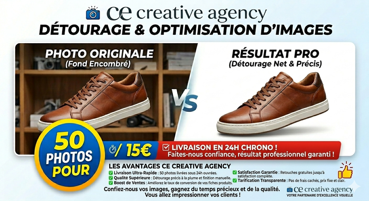 Je m'appelle Creative Agency et je suis spécialisé dans l'optimisation visuelle pour le e-commerce. Mon objectif est de transformer vos photos brutes en véritables outils de vente.