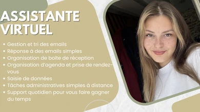 Vous êtes débordé(e) par vos tâches administratives ? Je suis là pour vous aider à gagner du temps et rester organisé(e). Assistante virtuelle sérieuse, organisée et réactive, je vous propose mon aide pour : ✔ Gestion et tri des emails ✔ Organisation d’agenda et prise de rendez-vous ✔ Saisie de données et tâches administratives ✔ Support quotidien à distance À l’aise avec les outils bureautiques (Google Docs, Excel, Outlook…), je m’adapte rapidement à vos besoins. Mon objectif : vous faire gagner du temps et vous simplifier la vie. 📩 N’hésitez pas à me contacter avant toute commande pour discuter de votre besoin.