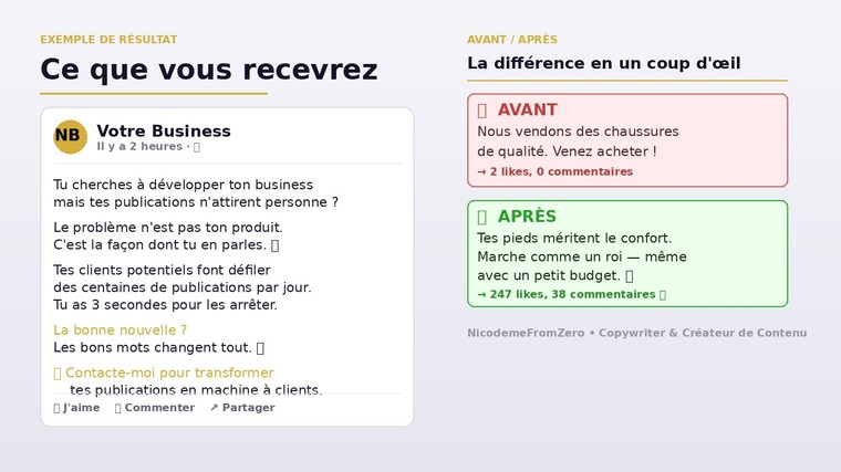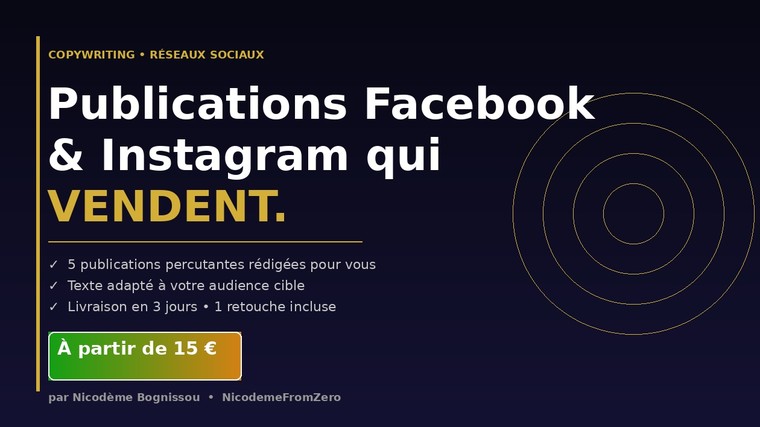 Je suis Nicodème, copywriter spécialisé dans la création de contenus percutants pour Facebook et Instagram. J’écris des publications qui accrochent, engagent et convertissent vos visiteurs en clients.