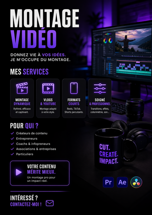 Je propose des services de montage vidéo adaptés à vos besoins, que vous soyez créateur de contenu, entrepreneur ou entreprise.