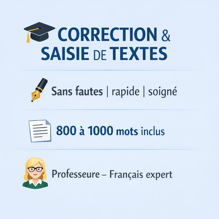 👉 Anne, professeure de l’Éducation nationale, titulaire d’un master, avec une excellente maîtrise du français écrit. Je vous propose mes services pour tous vos besoins en traitement de texte : ✔️ Saisie de documents (manuscrits, PDF, images) ✔️ Correction orthographique et grammaticale ✔️ Relecture et amélioration de vos textes ✔️ Rédaction de contenus simples et clairs ✔️ Mise en page soignée (Word, PDF) Habituée à lire, corriger et rédiger au quotidien, je travaille avec sérieux, précision et discrétion. 🎯 Mon objectif : vous fournir un document clair, fluide et sans aucune faute. Je m’adapte à vos besoins et je respecte les délais. N’hésitez pas à me contacter avant commande 😊