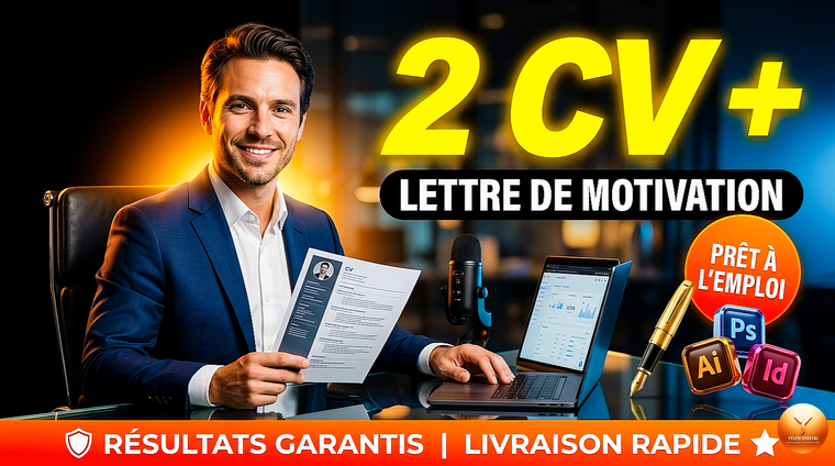 Un CV professionnel moderne, percutant, zéro template générique. Un contenu entièrement rédigé et optimisé pour ton poste cible. Une mise en page soignée, lisible, compatible ATS (les logiciels qui trient les candidatures avant les humains). Une lettre de motivation personnalisée, pas du copier-coller. Tes fichiers livrés en Word + PDF, prêts à l'emploi. Et des retouches incluses, jusqu'à ce que tu sois pleinement satisfait.