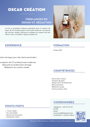 Je suis un freelance sérieux, motivé et passionné par le travail bien fait. Mon objectif est de vous fournir un service de qualité professionnelle, adapté à vos besoins et livré dans les délais convenus.
