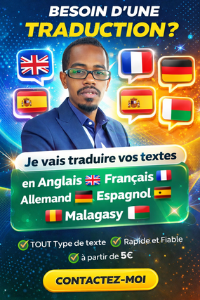 Je suis traducteur professionnel passionné par les langues et la communication, et je vous propose des services de traduction de haute qualité, adaptés à vos besoins spécifiques. Mon objectif est simple : vous offrir une traduction fidèle, naturelle et fluide, tout en respectant le sens et le ton du texte original.