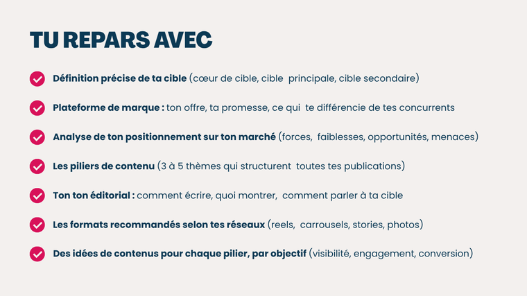 Ce service te donne une base stratégique solide pour communiquer avec méthode, même sans formation en marketing.