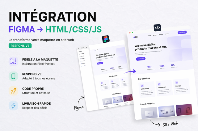 Je vous aide à convertir votre design en un site moderne, responsive et adapté à tous les écrans (mobile, tablette, desktop).
