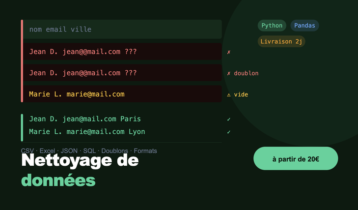 - Nettoyage de fichiers CSV / Excel (doublons, valeurs manquantes, formats)