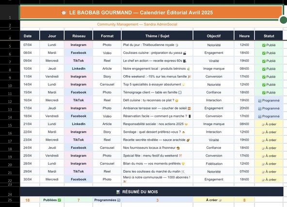 Je travaille à distance avec les entrepreneurs et PME francophones. Délai de livraison : 3 jours pour le calendrier éditorial.