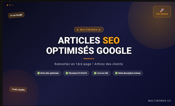 Chez MultiWorks je rédige des articles de blog et contenus web optimisés SEO qui font remonter votre site dans les résultats Google et attirent des visiteurs qualifiés.