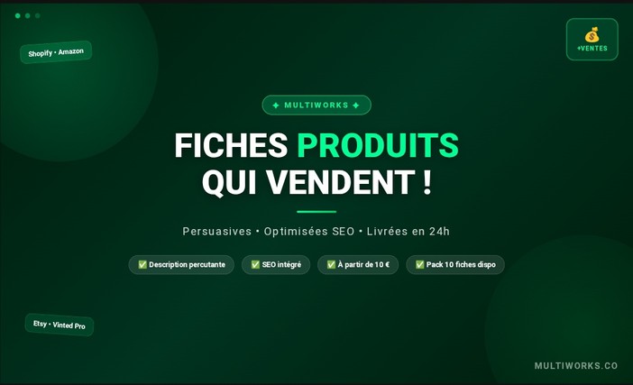 Chez MultiWorks je rédige des fiches produits percutantes, optimisées SEO et pensées pour convaincre vos clients d'acheter immédiatement.