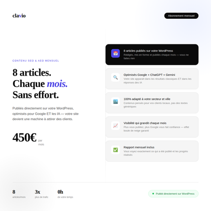 Je suis Gabriel, fondateur de Clavio.fr. J'aide les commerces et PME françaises à être trouvés sur Google ET sur les IA comme ChatGPT, Gemini ou Perplexity. Parce qu'en 2026, si vous n'apparaissez pas quand une IA répond à vos futurs clients — vous perdez des ventes chaque jour sans le savoir. Mon approche : pas de jargon, pas de promesses vides. Des résultats concrets, mesurables, livrés en 48h à 5 jours. Ce que je fais concrètement : — Audit de visibilité Google + IA en 48h Vous recevez un rapport clair avec vos pertes chiffrées et un plan d'action prioritaire — Contenus SEO & AEO qui attirent des clients qualifiés Articles optimisés pour Google ET pour les réponses des IA — votre nom apparaît là où vos clients cherchent — Gestion réseaux sociaux automatisée Posts créés, programmés et publiés chaque mois — vous ne faites rien — Chatbot IA installé sur votre site Il répond à vos clients, capte des leads et travaille à votre place 24h/24 Des dizaines de commerces français ont déjà récupéré des clients qu'ils perdaient sans le savoir. A votre tour.