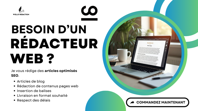 Je suis Monsieur Wells , rédacteur professionnel SEO avec 5 ans d'expérience au service de votre visibilité en ligne. Articles de blog, fiches produits, ebooks, gestion de blog, optimisation SEO; je prends en charge votre contenu de A à Z, en français et en anglais, pour que votre site attire les bons visiteurs et les convertisse en clients. Mon engagement : un travail soigné, livré dans les délais, avec un seul objectif en tête , votre croissance.