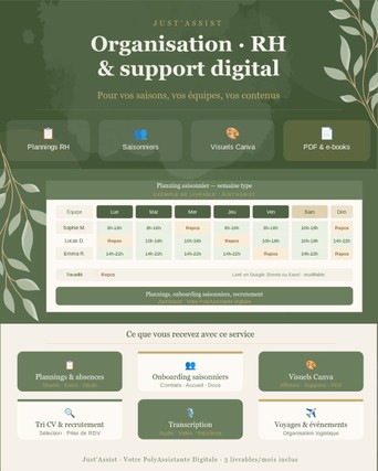 Proposé par JustAssist •Just'Assist - Votre PolyAssistante Admin Digitale | Tourisme · HCR · Entrepreneurs · Particuliers Professionnel Vente au total 0