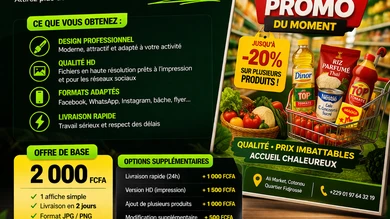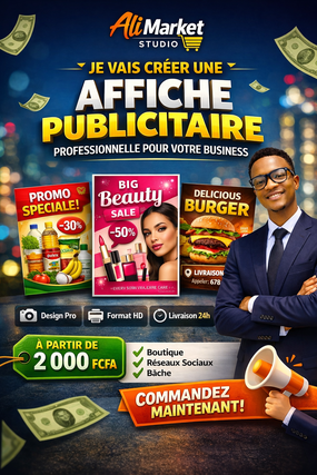 Vous cherchez un design professionnel qui attire l’attention et augmente vos ventes ? Vous êtes au bon endroit ! Je suis designer graphique spécialisé dans la création de : Affiches publicitaires Flyers professionnels Visuels réseaux sociaux Logos modernes Mon objectif : vous aider à attirer plus de clients avec un design impactant. Travail rapide et de qualité Révisions incluses Livraison professionnelle Contactez-moi maintenant pour discuter de votre projet ! Je réalises des affiches modernes, attractives et adaptées à votre activité (boutique, entreprise, événement, produits locaux, etc.). Ce que vous obtenez : Une affiche design professionnel Format adapté (Facebook, WhatsApp, impression bâche) Intégration de vos produits et informations Couleurs et style modernes Qualité HD. Idéal pour : Boutiques (comme alimentation, produits locaux). Promotions et offres spéciales Publicité sur réseaux sociaux Bâches et flyers