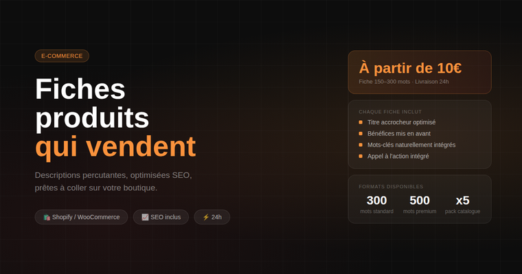 Une fiche produit mal rédigée, c'est un client perdu. Je rédige des descriptions qui mettent en valeur vos produits, lèvent les objections et incitent à l'achat — tout en étant optimisées pour le référencement naturel.