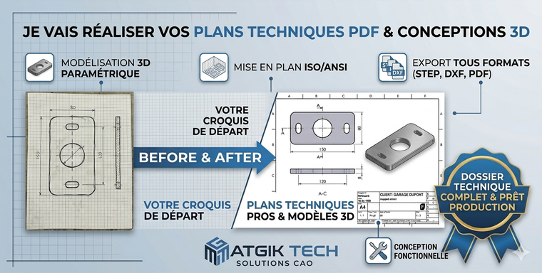 Je vais réaliser vos plans techniques PDF et conceptions 3D (STEP/DXF)
