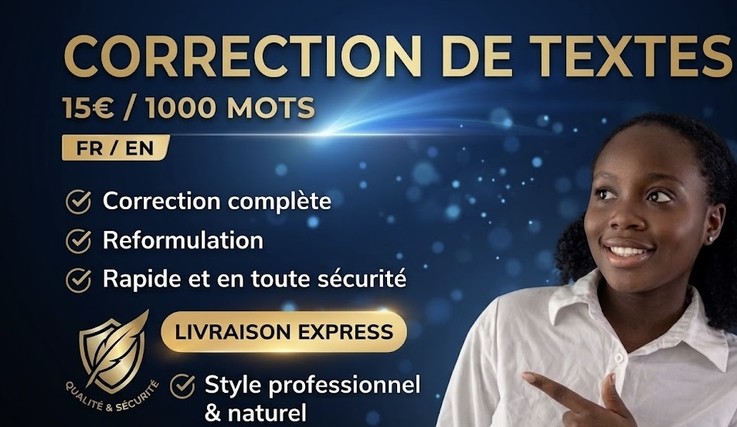 Vous voulez un texte impeccable, professionnel et sans la moindre erreur ? Une faute, une mauvaise formulation ou un texte mal structuré peut ruiner votre crédibilité… que ce soit pour un CV, un document professionnel ou un mémoire. 👉 Confiez-moi votre texte et obtenez un résultat clair, fluide et professionnel. 🔥 OFFRE DE LANCEMENT : -30% pour mes 3 premiers clients ! Faites-moi confiance et laissez-moi vous prouver la qualité de mon travail. 💼 CE QUE JE VOUS GARANTIS ✔️ Un texte corrigé avec précision ✔️ Une amélioration du style et de la clarté ✔️ Une reformulation si nécessaire ✔️ Le respect du sens original ✔️ Un rendu professionnel et prêt à être utilisé 👍 POURQUOI ME CHOISIR ? ✔️ Travail sérieux et soigné ✔️ Livraison rapide ✔️ Communication fluide ✔️ Confidentialité totale 📩 Contactez-moi dès maintenant et transformez votre texte en un contenu professionnel de qualité.