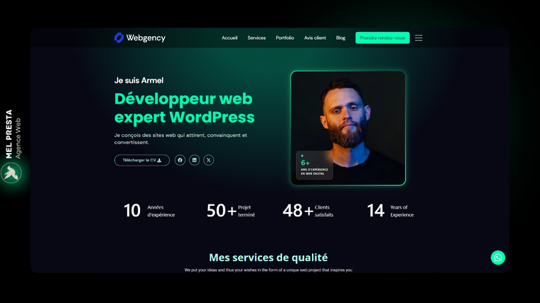 Je suis Armel, développeur WordPress et expert Elementor, fondateur de l'agence web Mel Presta avec plus de 06 années d'expérience, je suis spécialisé dans la création de site web sur mesure, rapides, modernes et optimisés pour les moteurs de recherche.