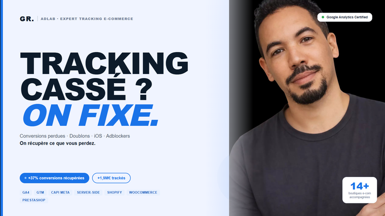 Consultant e-commerce spécialisé en tracking et acquisition payante, j'interviens sur Shopify, WooCommerce et PrestaShop pour des boutiques françaises et européennes.