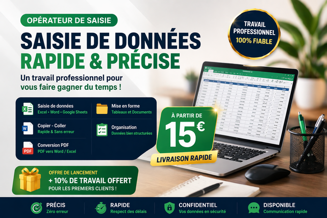 Bonjour 👋 Vous manquez de temps pour gérer vos tâches répétitives ou administratives? ✔️ Je suis là pour vous simplifier la vie. Je suis spécialisé en saisie de données et assistance virtuelle, avec pour objectif de vous faire gagner du temps tout en vous garantissant un travail rapide, précis et organisé. 🎯 Ce que je vous propose : 💻 OPÉRATION DE SAISIE 👉Saisie de données (Excel, Word, PDF) 👉Copier-coller rapide et sans erreur 👉Conversion de fichiers 👉Mise en forme professionnelle 🧑💼 ASSISTANCE VIRTUELLE ✔️Gestion de tâches simples ✔️Recherche sur internet ✔️Organisation de documents ✔️Support administratif 💡 Pourquoi me faire confiance ? ✔️ Travail précis et sans erreur ✔️ Respect des délais ✔️ Communication rapide et claire ✔️ Sérieux et confidentialité garantis 🔒 🚀 Mon objectif est de vous aider à vous concentrer sur l’essentiel pendant que je m’occupe du reste. 🎁 Offre de lancement : ✔️ Bonus de travail offert pour les premiers clients ✔️ Réactivité maximale 💬 Disponible et à l’écoute, je prends toujours le temps de comprendre votre besoin avant de commencer. 👉 Contactez-moi dès maintenant, je vous répondrai rapidement pour vous proposer la meilleure solution adaptée à votre projet.