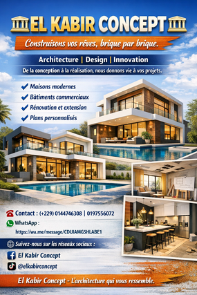 🏛️ El Kabir Concept 🏛️ Construisons vos rêves, brique par brique. 📐 Architecture | Design | Innovation De la conception à la réalisation, nous donnons vie à vos projets. 🔹 Maisons modernes 🔹 Bâtiments commerciaux 🔹 Rénovation et extension 🔹 Plans personnalisés 📞 Contact : (+229) 0144746308 0197556072 WhatsApp : https://wa.me/message/CDUIAMG5HLABE1 🌐 Suivez-nous sur les réseaux sociaux : fb: El Kabir Concept TikTok: @elkabirconcept El Kabir Concept – L’architecture qui vous ressemble.