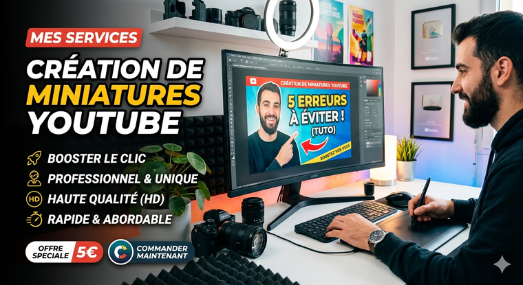 Le succès d'une vidéo commence par son emballage. Une miniature professionnelle est le facteur n°1 qui pousse un utilisateur à cliquer. Vous avez le contenu, je crée l'impact visuel.