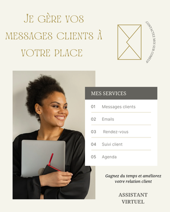 Bonjour et bienvenue sur mon profil, Je propose mes services en tant qu’assistant virtuel afin d’aider les entrepreneurs et les entreprises à gérer leurs messages clients et leurs e-mails au quotidien. Aujourd’hui, la communication rapide avec les clients est essentielle pour une entreprise. Répondre rapidement aux messages et aux e-mails améliore la satisfaction des clients et l’image professionnelle de votre activité. Je vous propose donc de vous faire gagner du temps en prenant en charge certaines tâches administratives et de communication. Je peux vous aider pour : ✔ répondre aux e-mails de vos clients ✔ répondre aux messages sur les réseaux sociaux ✔ gérer les demandes d’informations ✔ organiser les rendez-vous ✔ assurer un suivi professionnel avec vos clients Je travaille avec différents outils comme : • Gmail • Google Calendar • WhatsApp • Instagram Sérieux, organisé et réactif, je m’engage à offrir un service professionnel et à représenter au mieux votre entreprise auprès de vos clients. N’hésitez pas à me contacter pour discuter de vos besoins..